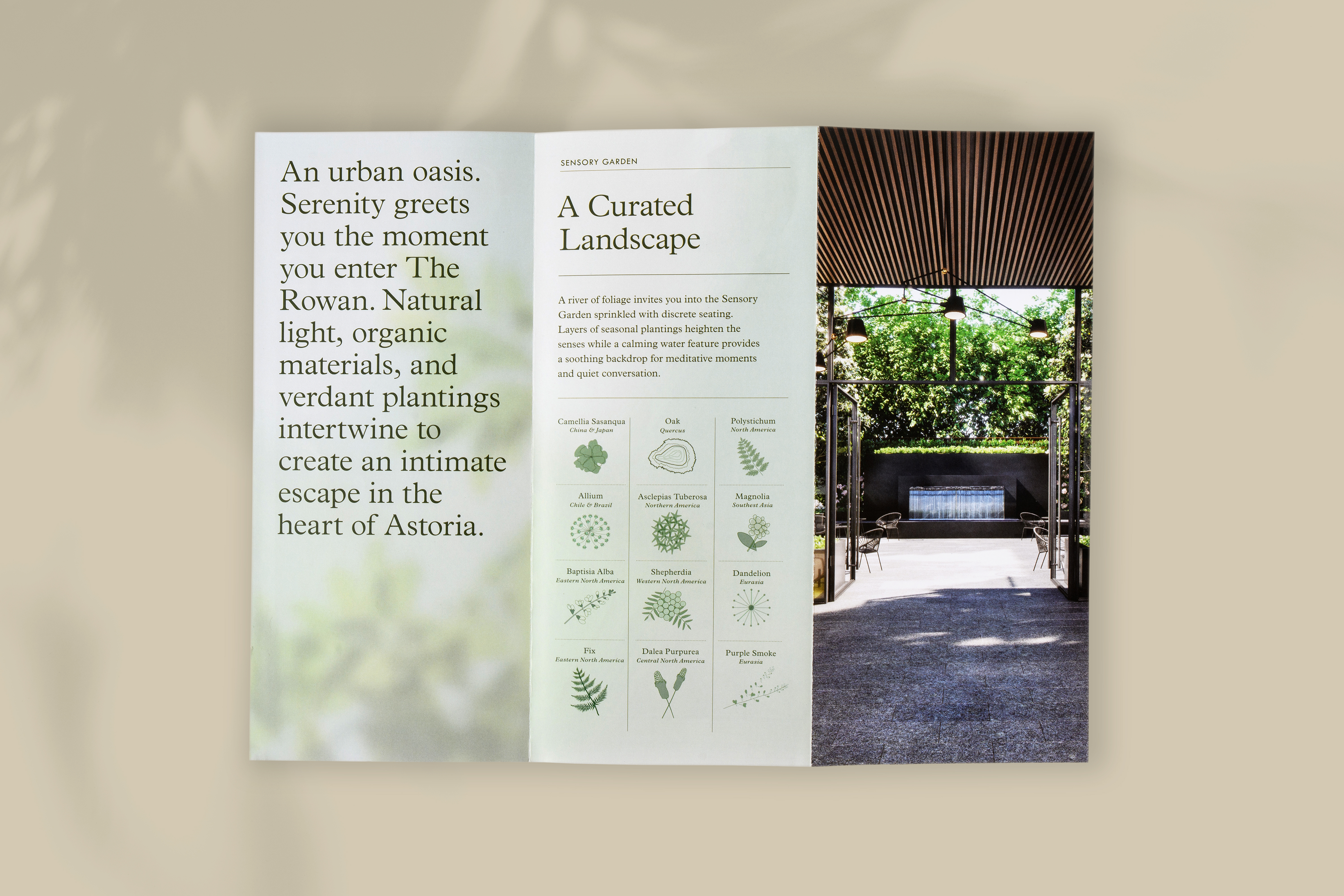 Serenity greets you the moment you enter The Rowan. I created a visual voice indicative of the natural light, organic materials, and verdant plantings that were intertwined to create an intimate escape for tenants in the heart of Astoria, Queens.